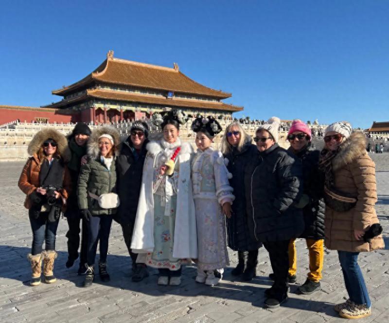 美国旅游团在故宫巧遇“盛装”的中国游客,大家开心合影